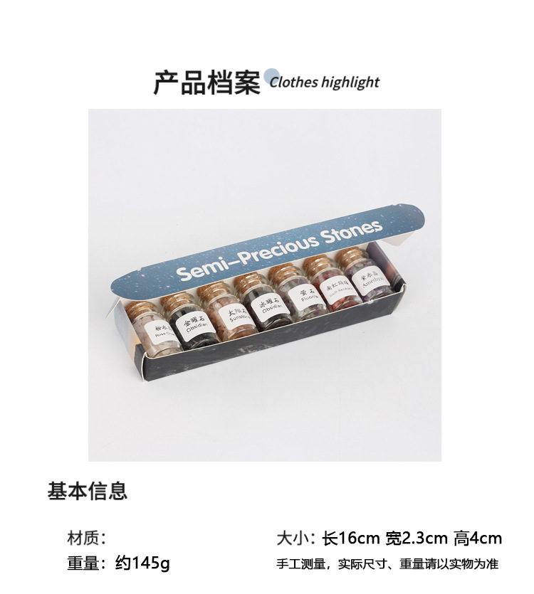 | Purity | Empty Box (can Hold 7 Pieces), Colorful, White Crystal, Pink Crystal, Yellow Crystal, Amethyst, Dongling Jade, Red Agate, Obsidian, Sunstone, Fluorite, Tiger Eye Stone, Blue Patterned Stone, Red Stone, Opal, White Turquoise, Elongated Stone, Lapis Lazuli, Tianhe Stone |