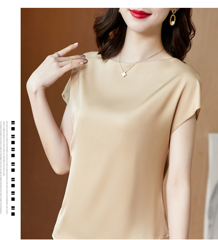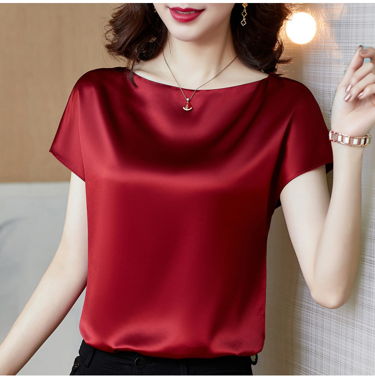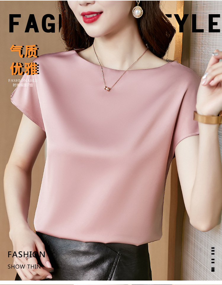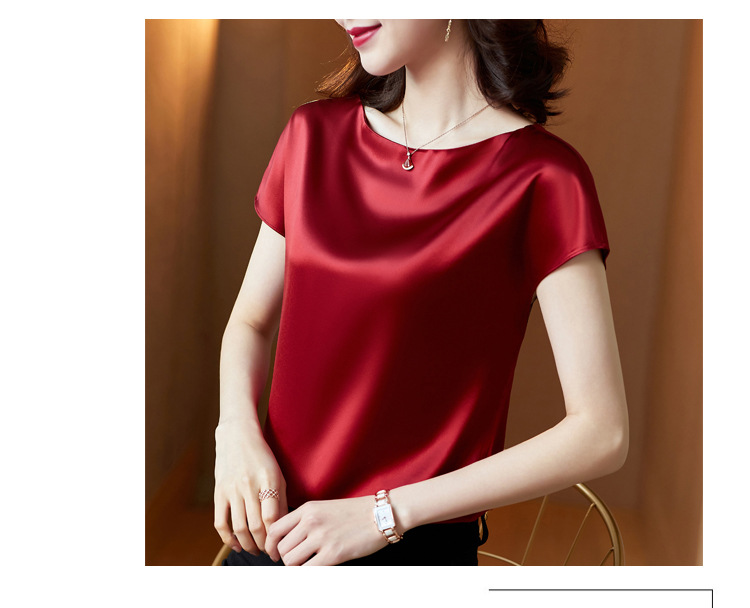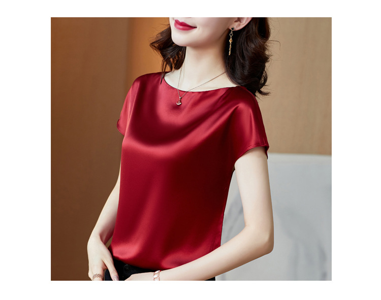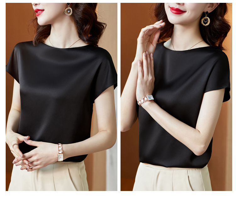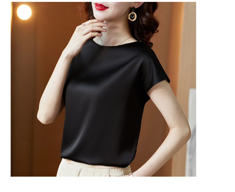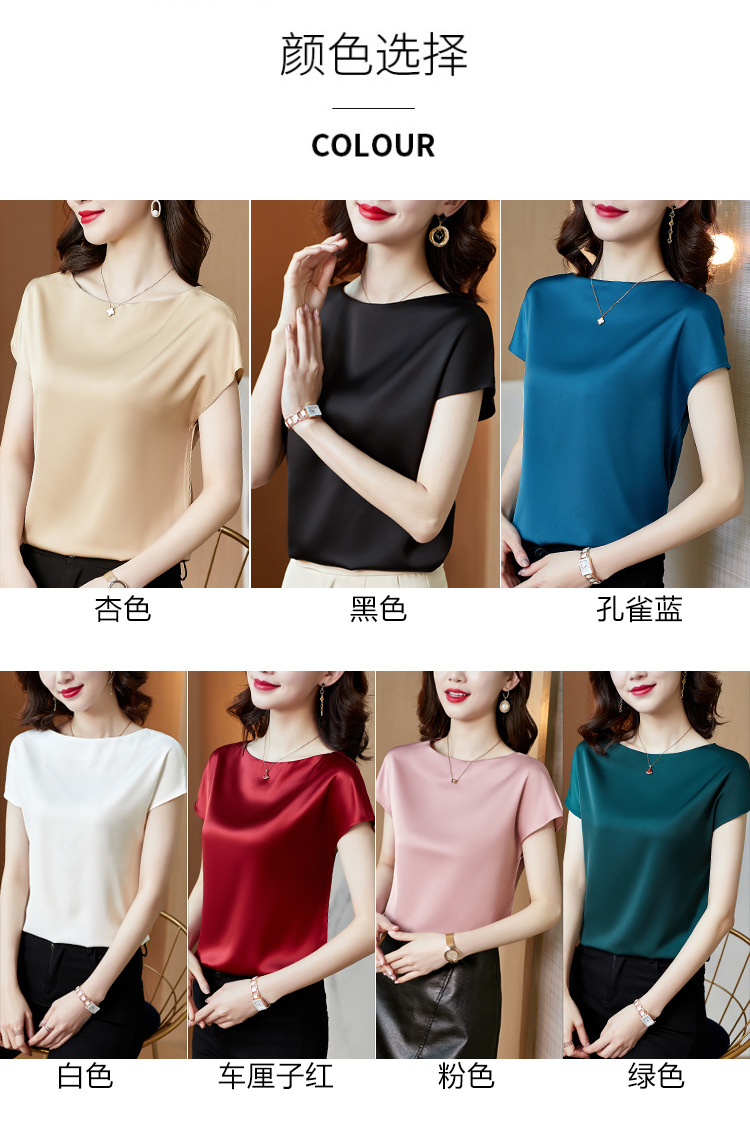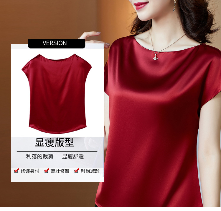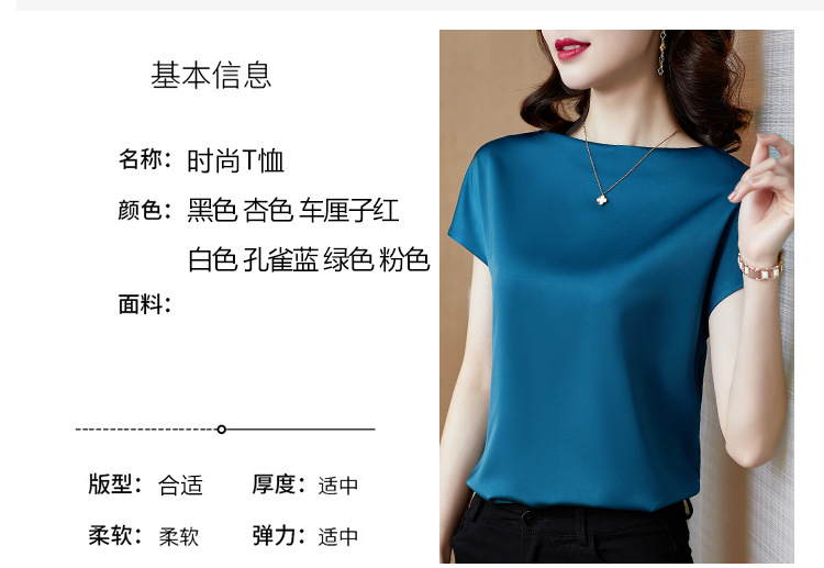 圆领短袖t恤女纯色桑蚕丝质感上衣大码宽松缎面打底衫一手货源批